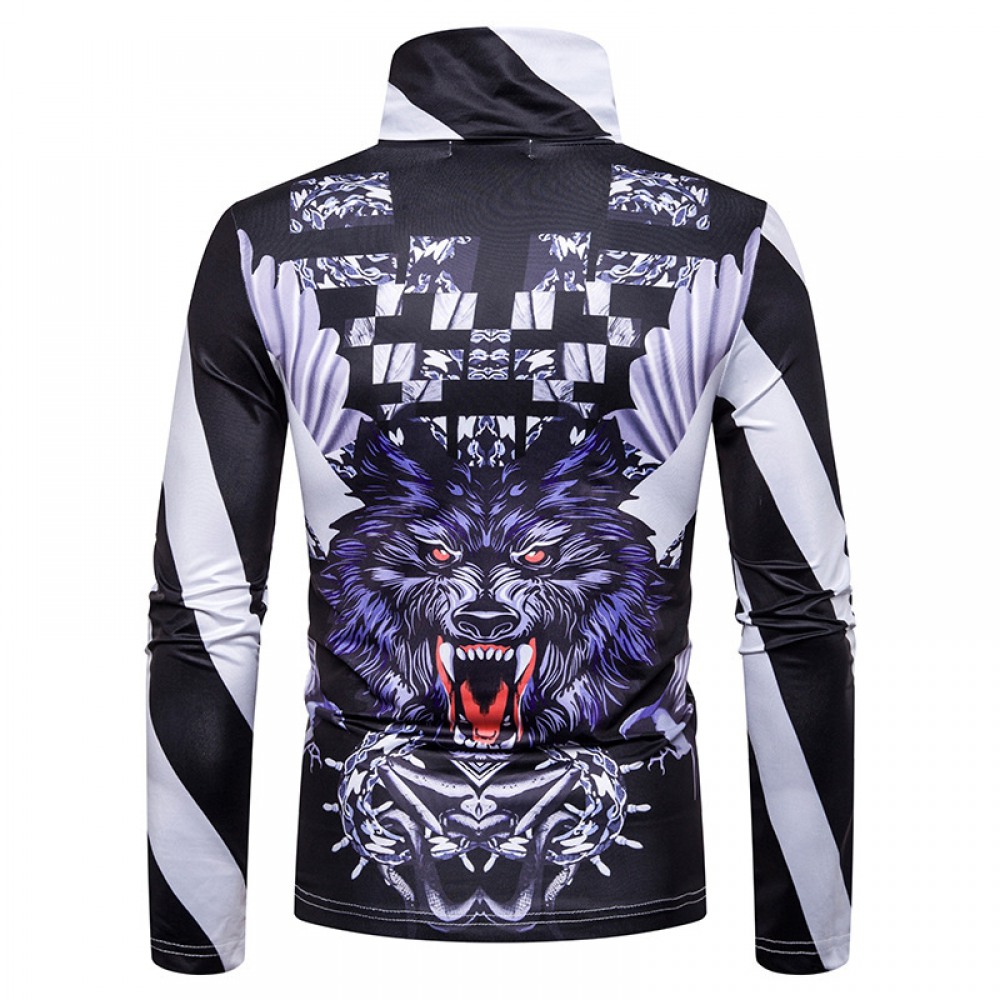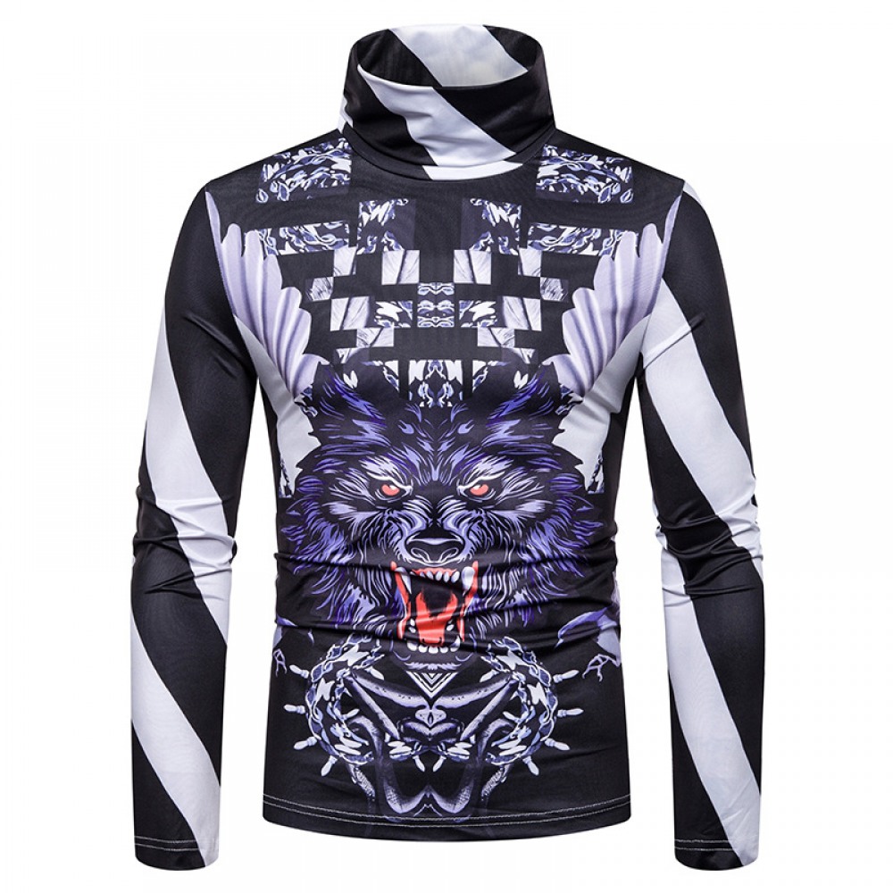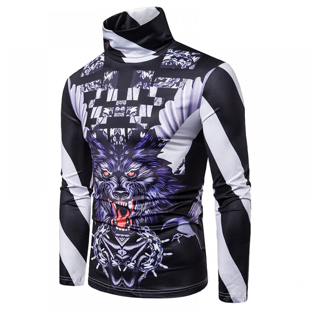 New Men's Plus Size 3D Cheetah Stripe Print High Neck Long Sleeve T-Shirt Bottoming Shirt